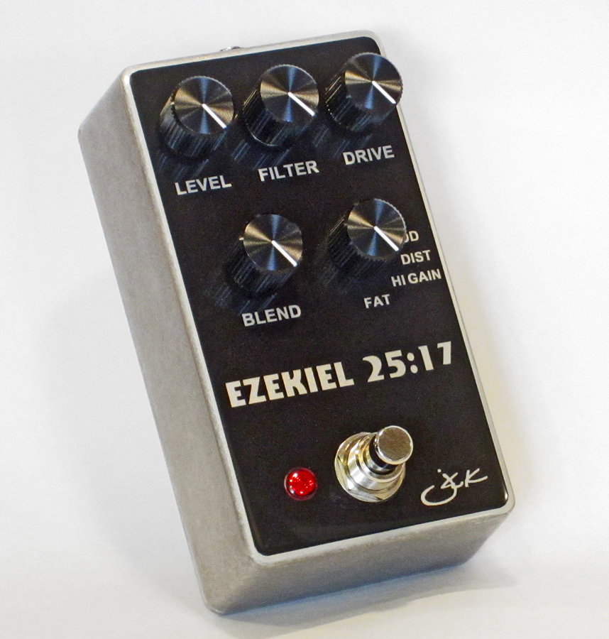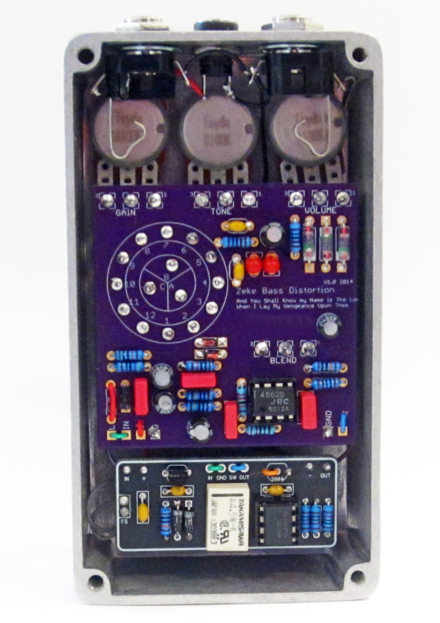 My newest version of the D*A*M Ezekiel in a smaller 125B enclosure (WAY smaller than the HUGE original one). These legendary bass distortion pedals have been long discontinued and with originals selling for $650-700 (or more!) these days I thought that I'd offer another one of my 125B versions of them. It has a 4-way rotary clipping switch, a 'Filter' control (tone), a clean 'Blend', a 'Drive' (gain/distortion control) and a 'Level' (which controls the level of the distortion circuit). The original JRC4562 chip for them is no longer made but I was able obtain a few more of them so that it maintains the exact original circuit. It comes in black and silver 125B enclosure,with anodized aluminum knobs, (Lumberg) top jacks and WIMA capacitors . It also has relayed true bypass with soft touch stomp switch (the originals had a standard clicking bypass).. My pedals are hand-made by myself and made in very limited quantities. I prep & label the enclosures, mount & hand solder all of the components and wire and test them before they ship, making them a truly hand-made boutique pedal. Nothing is farmed out.