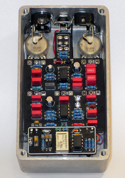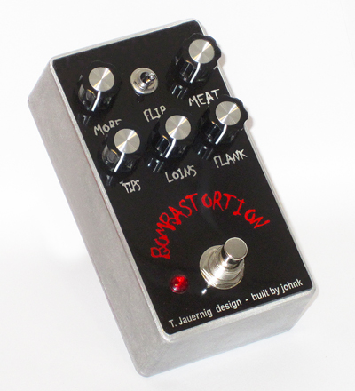 This is my clone of T.Jauernig's Bombastortion. These are VERY Rare and hard to find at a reasonable price these days. The ones that are listed on Reverb currently are ranging from $1270- $3000! The originals have all side jacks but I built this one in a 125B with all top jacks (Lumberg). The original also has a regular clicking 3PDT bypass, but I used a relayed soft click true bypass in my version. I used high quality resistors all but one Wima film capacitors. This pedal sounds great with both a bass and guitar.