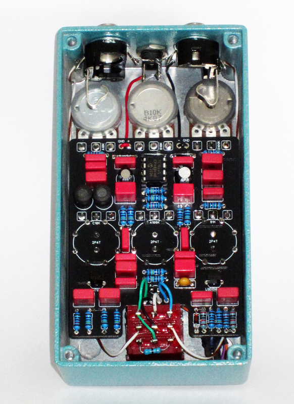 This is my clone of the now sold out Spaceman Equinox Pultec style equalizer. Spaceman limited production to only 222 units so if you missed out on them, here's you chance to get one, but this one is in a much smaller 125B enclosure with all top jacks has a few added improvements. The original was $399 +shipping and came in a HUGE 1590XX with side jacks. I also think that the 125B's control layout is easier to understand and navigate. This one has Lumberg 1/4" and DC jacks and ALL WIMA film capacitors (see gut shot).