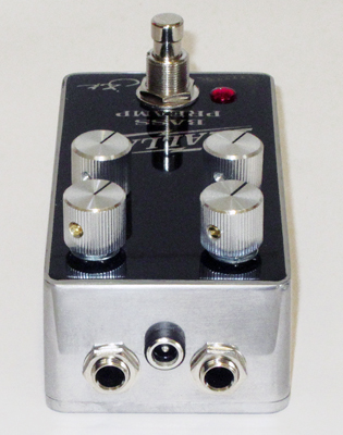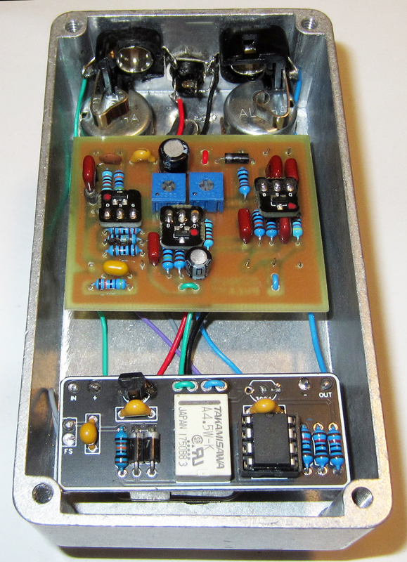 For this one, I used my own hand wired acid etched and tin plated PCB mounted it in a polished and labeled 1590B2 with a relayed true bypass and with all top jacks (Lumberg) and high quality Panasonic film capacitors.