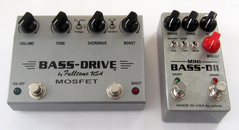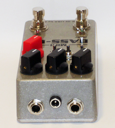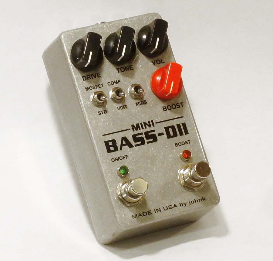 Fulltone ceased offer their Bassdrive Mosfet years ago, so this is my mini version of it with all of the features of the original but in a much smaller 125B enclosure. In my opinion, it's a great sounding bass overdrive that can be used as a clean boost, a slightly dirty drive, or all the way up to a very heavy overdrive/distortion. It has a 3 mini switches for mosfet/standard, comp (comp-cut), mids (flat mids). On the Mosfet/ standard switch, standard is dual asymmetrical silicon diodes, and the other, an asymmetrical mosfet/germanium clipper. The comp mode setting removes the clipping circuit but still yields a fair amount of overdrive with the drive control. This pedal comes in 125B with all top jacks, a true bypass (left-green led) and a Boost footswitch (right- red led) which corresponds to the red knob for the level of the drive. It can run on a standard negative center 9 volt power supply or also be used with up to an 18 volt power supply for more headroom and output.